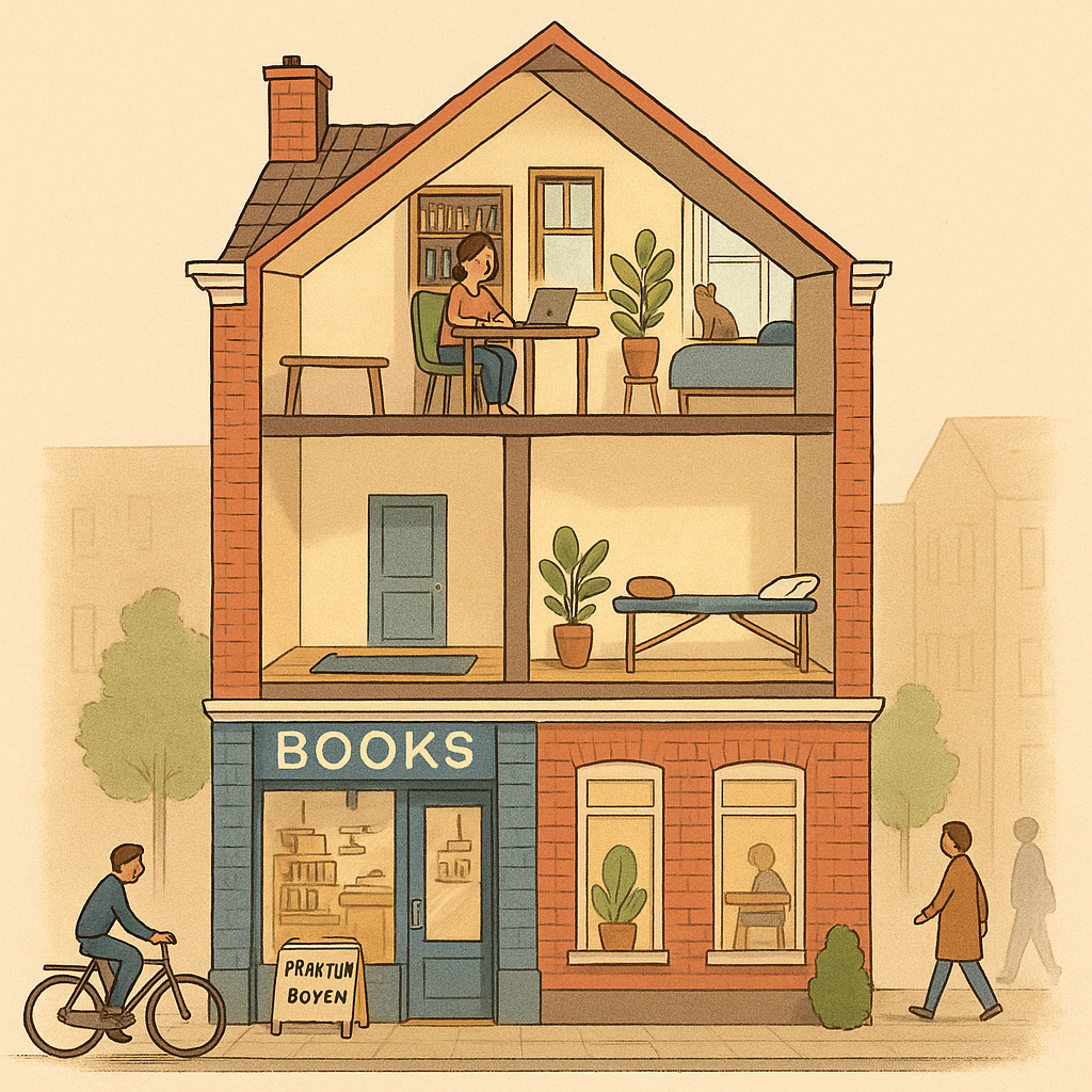 Denk bijvoorbeeld aan een psycholoog met een praktijkruimte van 35 m², een freelance ontwerper met een studio boven een boekwinkel, of een yogadocent die de ruimte deelt met een massagepraktijk.