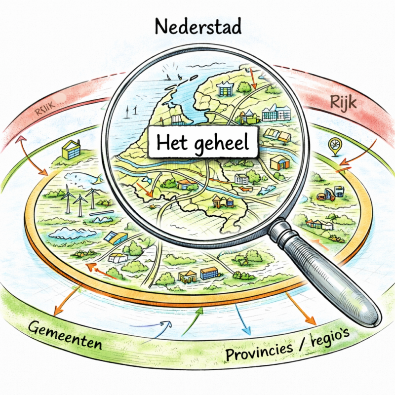 De vraag richt zich dus niet alleen op wie beslist, maar, belangrijker nog, wie het totaaloverzicht bewaart. En misschien nog fundamenteler: nu Nederland als één stad functioneert, wat is er dan echt nodig om weloverwogen keuzes te maken tussen de verschillende lagen, die verder reiken dan alleen de politiek van de korte termijn?