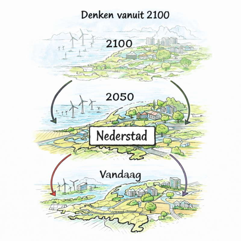 Een Nederstad-benadering zou daarom kunnen beginnen bij een eenvoudig te stellen vraag: Hoe moet Nederland functioneren in het jaar 2100? Vanuit een zo’n verkennende tijdshorizon kun je vervolgens in terugwerkende kracht redeneren en plannen maken: