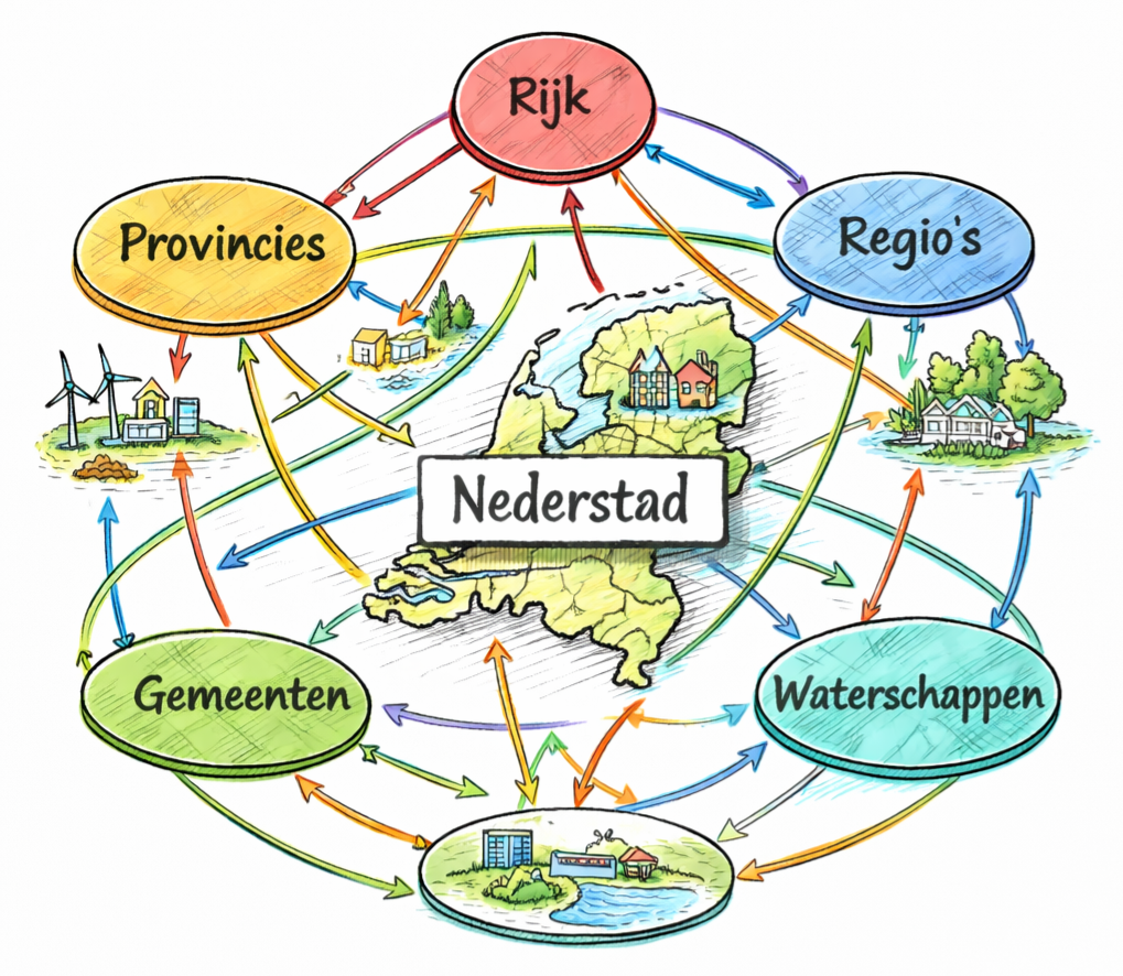De Amerikaanse politicoloog Elinor Ostrom beschreef dit complexe systeem als polycentrisch bestuur: een unieke structuur waarin meerdere bestuurslagen gezamenlijk een complex systeem aansturen en beheren (bron: Nobelprijslezing 2009). Dit resulteert in een netwerk van besluitvorming in plaats van slechts één centraal sturingspunt. Voor Nederstad betekent dit wellicht dat ruimtelijke ontwikkeling minder lijkt op een hiërarchie en meer op een harmonieuze dans tussen bestuurslagen, waarbij samenwerking essentieel is voor succes.