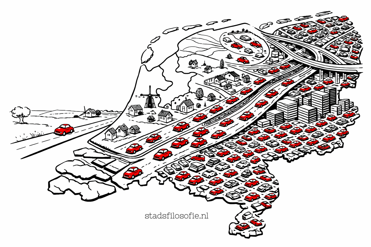 Zeventig jaar later is dit volledig veranderd. Rond 2020 stond er gemiddeld één auto op elke twee Nederlanders. De auto is niet langer een bijzonder bezit, maar een vanzelfsprekend onderdeel van het dagelijks leven. Niet alleen als vervoermiddel, maar ook als bepalende factor in de inrichting van onze ruimte: straten, wijken, bedrijventerreinen en zelfs het landschap worden steeds meer afgestemd op zowel rijdende als geparkeerde auto's.